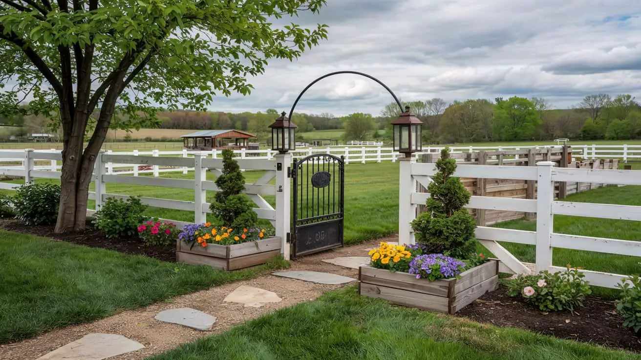 Use rustic wood or white picket fencing so it feels cohesive with the landscape. You can even grow climbing plants like jasmine or clematis along the fence for a softer, natural look. The contrast between greenery and open pasture makes the whole space feel structured but still relaxed.
