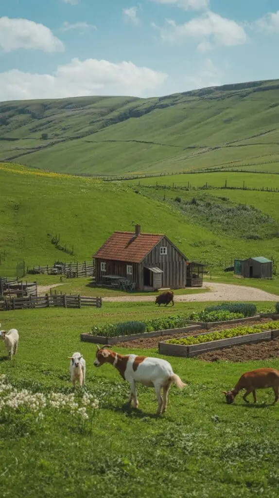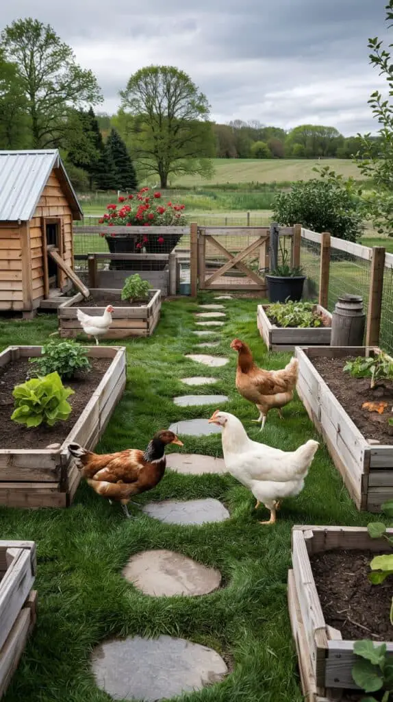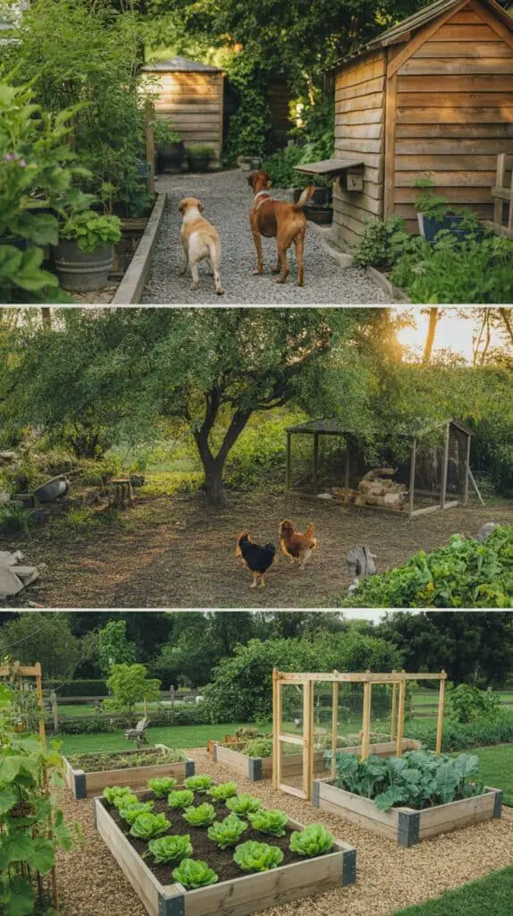 This setup blends the practicality of a small farm with the beauty of a landscaped garden. Start by designing a fenced pasture beside your vegetable garden — or even weave the two together. Chickens can roam between raised beds, ducks can patrol near the pond, and dogs can watch from a shaded yard section.