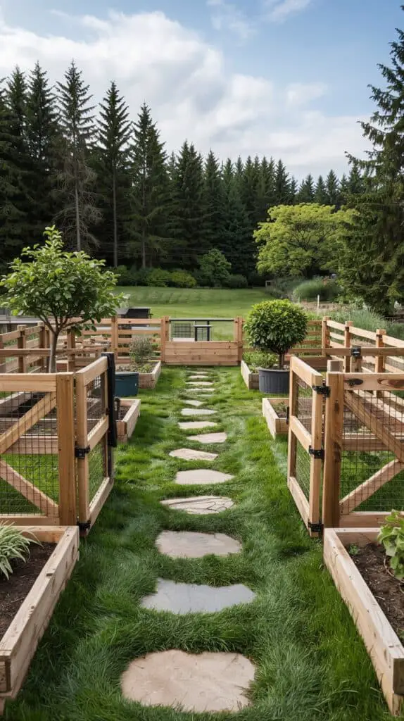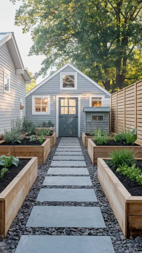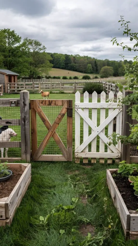 A few rustic details — like a mini gate or small shed for storage — add charm and function. It’s ideal for suburban homes where you want the look and rhythm of a farm without the acreage.