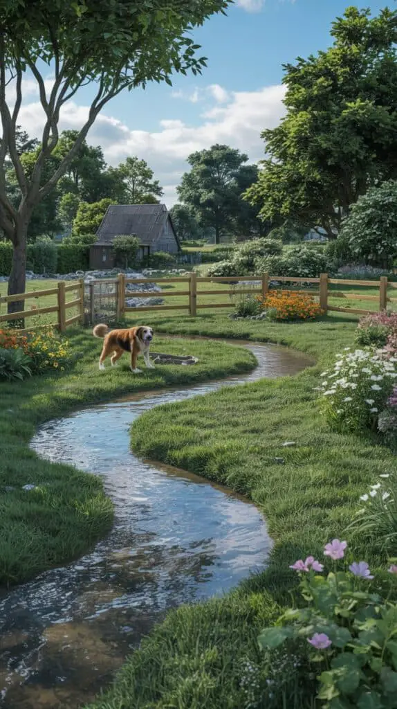 A stone water bowl, small bench, and decorative gate can turn it into something that feels more like a retreat than a pen. It’s the kind of design that keeps your outdoor space calm, clean, and cohesive while still giving pets the freedom to enjoy it all.