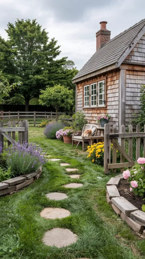 If your style leans cozy and traditional, this design brings that warm cottage energy outdoors. Think a grassy pasture bordered by weathered wooden fencing, small stone paths, and flowering borders.