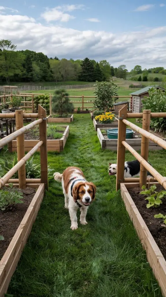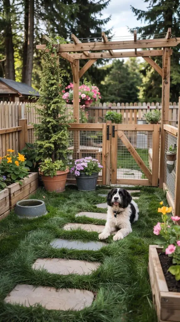 Add a small wooden gate to divide areas — one for pets and one for lounging. It’s simple but charming, especially when mixed with lavender, roses, or even edible herbs near the fence line. Perfect for smaller yards where space doubles as both family garden and pet haven.