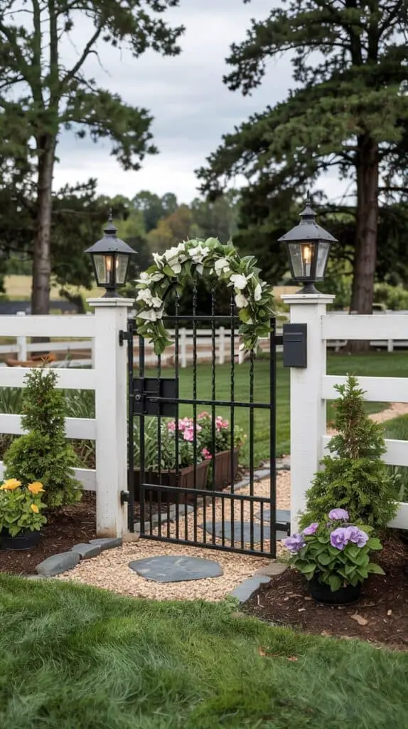 If you want your pasture to look good from every angle, this one’s about balancing charm with structure. Use fencing as part of the design — black iron, white vinyl, or rustic wood all work depending on your house style. Line the fence with small evergreens or flowering hedges.