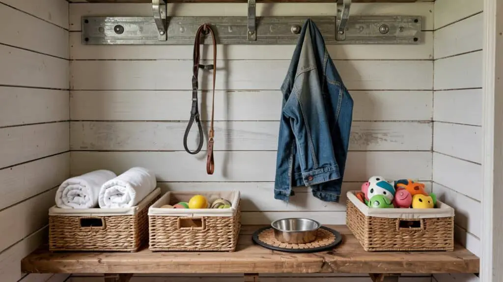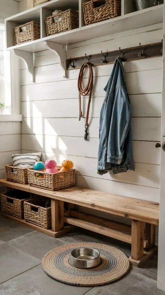 Got a little extra room near the laundry or garage? Use it! A low shelf, a few baskets, hooks for leashes, and a mat for boots or food bowls can create a mini dog mudroom.