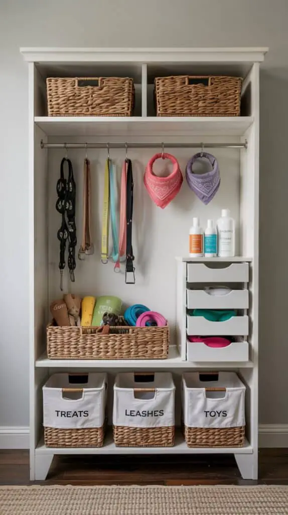 If you’ve got a spare cabinet, hallway nook, or unused linen closet, it’s the perfect spot to create a dedicated dog closet. Stackable bins for toys, labeled drawers for grooming tools, and a small hanging rod for harnesses and jackets turn chaos into calm.