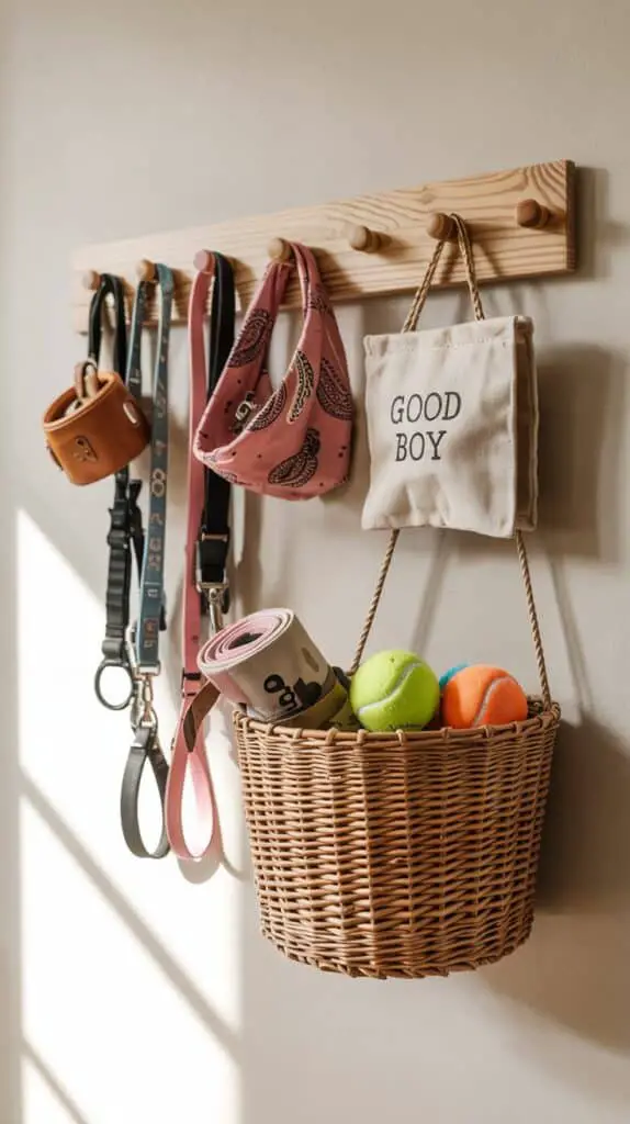 It keeps dog gear off the floor and doubles as wall decor if you keep the palette cohesive. You can even clip a mini canvas pouch to the wall for poop bags and spare tags. It’s like a little dog command center—with serious Pinterest potential.