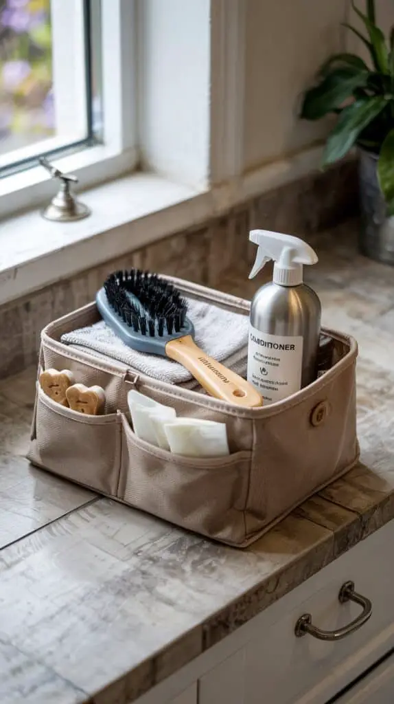 Choose a material that’s easy to clean—plastic, silicone, or sealed wood. Add a small towel, toothbrush, and extra treats if you use bribery (who doesn’t?). Now when it’s bath day or brush time, you’ve got everything in one place—no more rummaging under the sink while holding a wet dog.