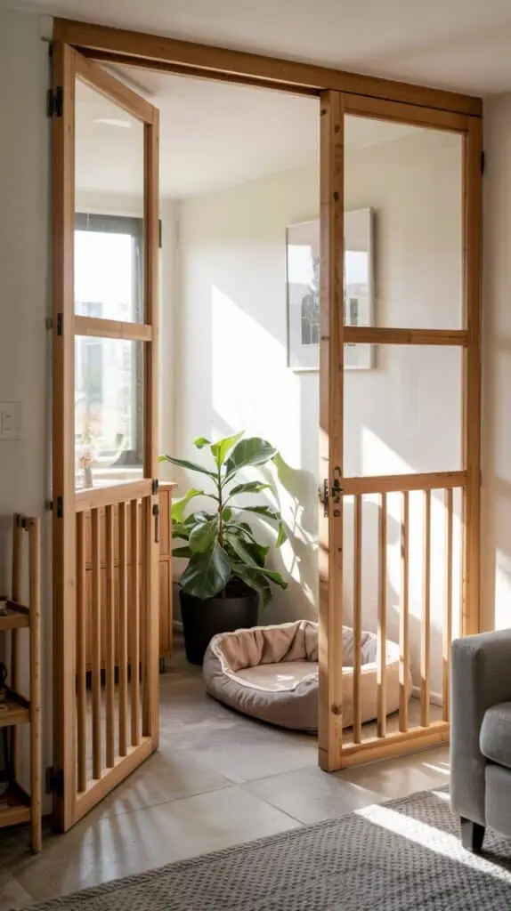 If your pup loves the whole house a little too much, a soft dog barrier can create calm zones—especially helpful in open-concept homes or apartments. Use a foldable wooden gate or DIY a canvas curtain between spaces.