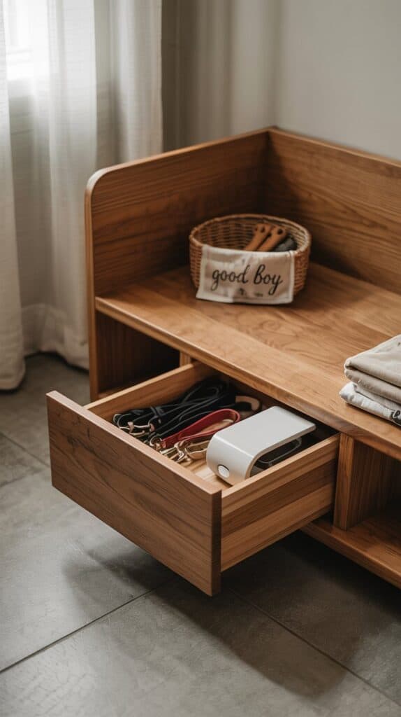 Your entryway is probably already the go-to leash-drop zone, so why not turn it into a smart storage spot too? Use a cabinet with hidden bins or drawers for treats, waste bags, and wipes.