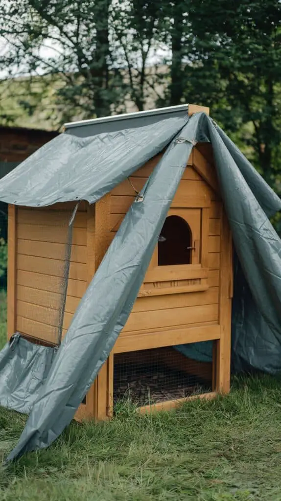 Tarps can get… tacky. But they also work. The trick is to use a neutral-toned tarp (brown, green, or gray) and secure it tightly over the top and sides of the hutch like a little tent.