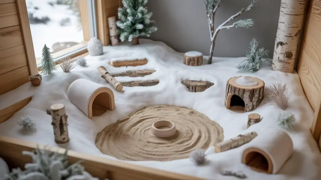 Winter setups are all about comfort and insulation. Create a base that’s extra deep, at least 25–30 cm of paper-based bedding for serious tunneling. Add a few cozy hideouts made from small baskets or wooden boxes filled with nesting material. Keep the colors neutral—cream, gray, and brown—to give it that frosted, Scandinavian look.