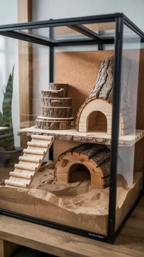 For colder months, think of a hamster version of a rustic mountain cabin. A glass terrarium works beautifully here, especially with wood textures and deep layers of bedding. Use wooden hides, bark pieces, and tiny handmade ladders to create a layered, burrow-friendly setup.