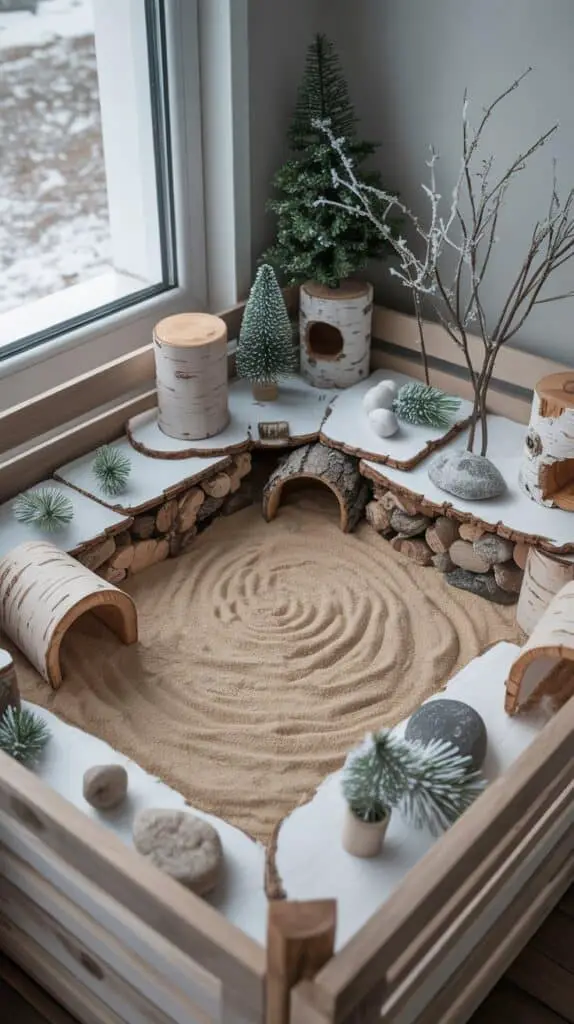 Add a sand area in one corner for texture contrast, and try a background of warm-toned paper or natural cork board to give it that snug, indoor feel. This design works well if your cage sits somewhere visible—it blends right in with winter home décor.