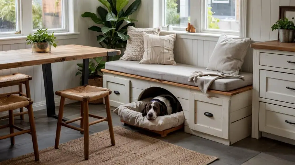 This setup works great in kitchens with dining nooks, long walls, or under-window seating, giving you extra seating and a hidden dog-friendly space all at once.