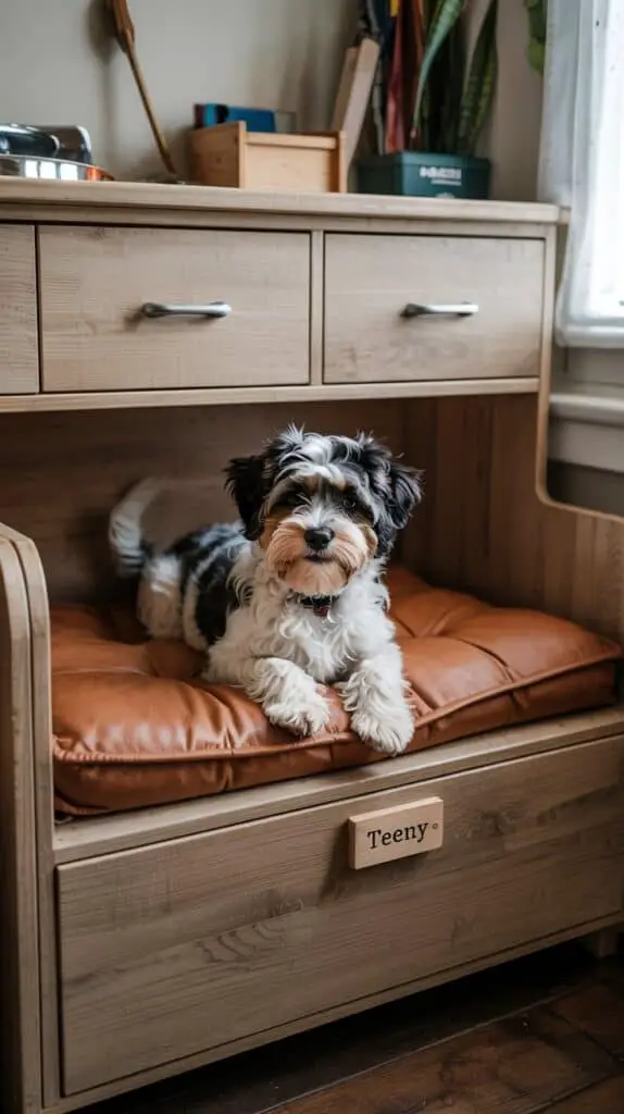 Use a wooden stand with two bowls, add a raised shelf for storage, and place a soft bed right beside it. Style the area with warm textures — wood crates, metal hooks, a tiny rug, maybe a rustic chalkboard with your dog’s name.