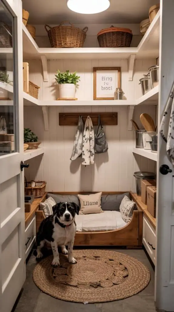 This layout feels especially charming because the dog gets a quiet corner away from the main cooking zone. Turn the space beside or between pantry doors into a little nook using a wooden platform, soft bedding, and a few farmhouse décor touches (like wicker baskets or framed prints above).