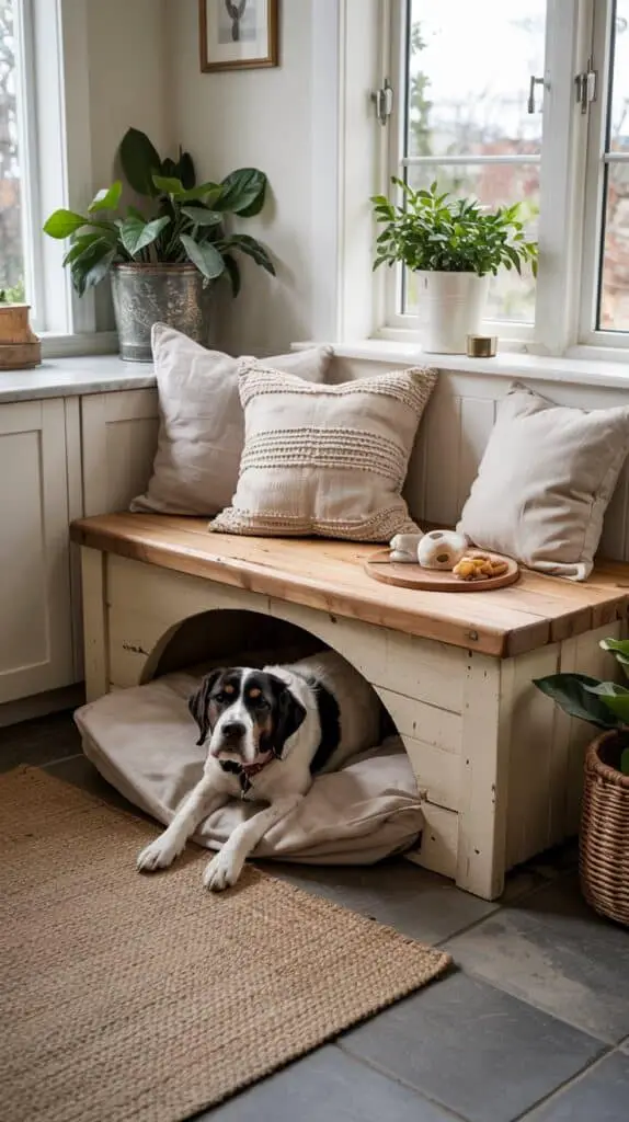 This idea blends seating and a dog nook into one clever piece. Use a farmhouse-style bench — wooden, distressed paint, or upholstered in linen — and build a dog bed underneath it, almost like a cosy tunnel.