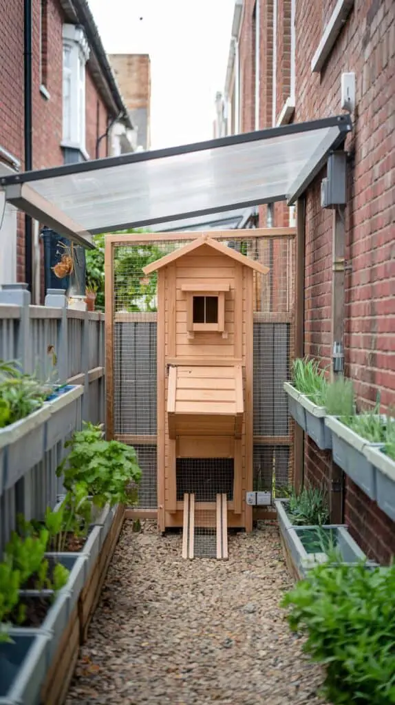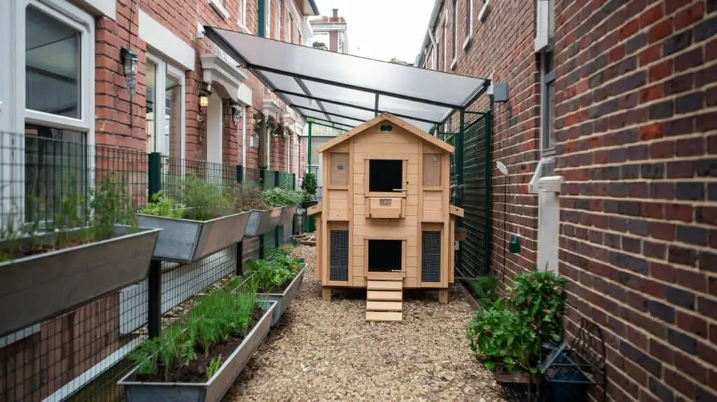 In a long, narrow backyard behind a red-brick city terrace, space is tight — but chickens can still thrive here with a smart setup. The house backs onto a concrete path with a small sliver of grass on one side and a high wooden fence on the other. A sleek, upright coop built vertically with three internal levels makes the most of vertical space. The coop is tucked against the fence, with a ramp leading down to a compact run that uses gravel for drainage and weed mesh underneath.