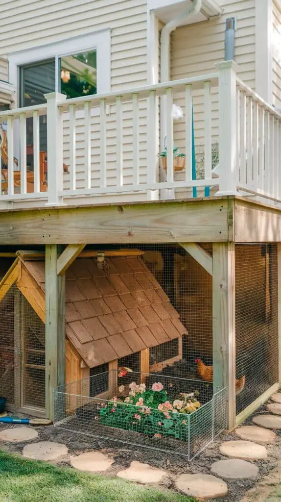 For homes with a raised wooden deck — like many Florida or Texas ranch-style homes — the space underneath can become a shady, practical chicken zone. This small backyard has grass, a curved flower bed, and stairs leading up to a deck with white railing. Underneath, a custom-built coop uses the full length of the space, framed with hardware cloth for airflow and safety.