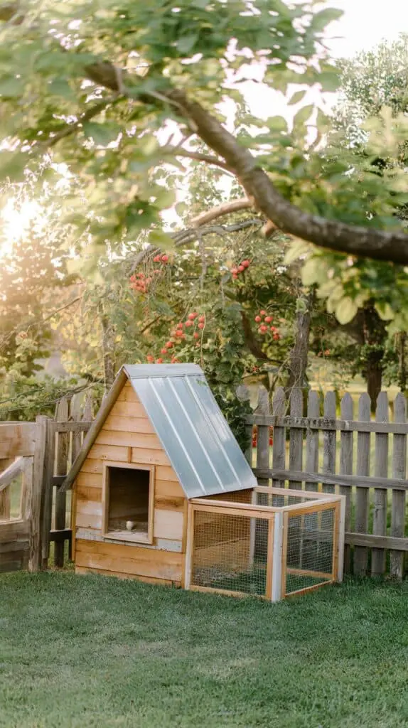 Inside the coop, there’s a roosting bar across the back and a raised nesting area with straw and cedar shavings. A rustic wooden gate separates the chickens from the rest of the garden, but the space still feels open and pastoral. The chickens roam on grass during the day and tuck themselves in at sunset like clockwork. It’s small, low-tech, and works beautifully for families who like things simple.