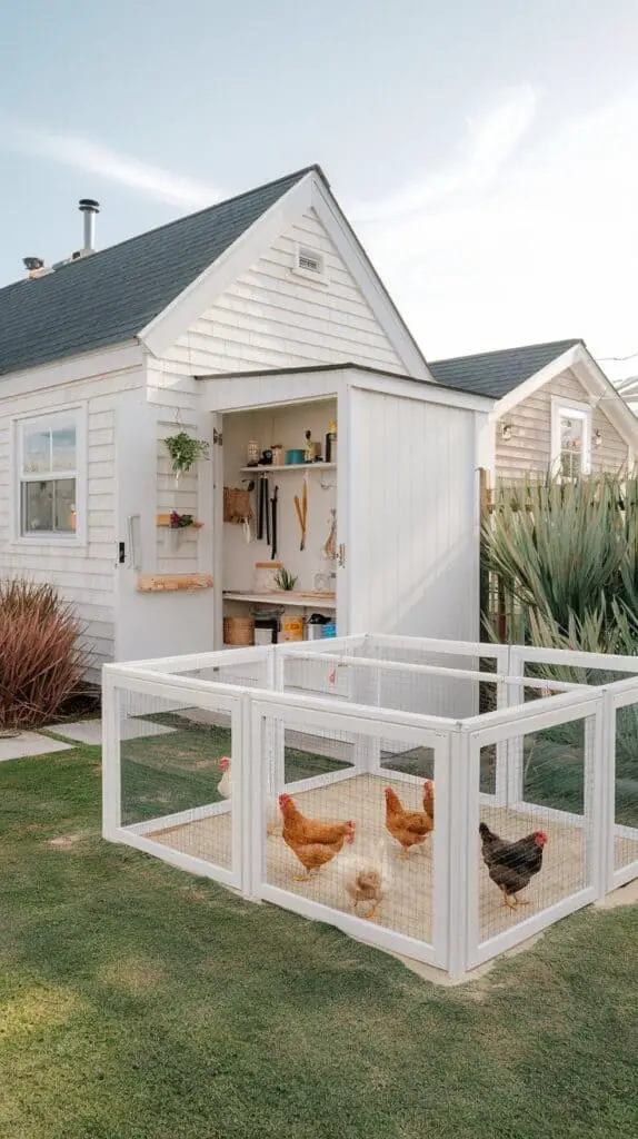 The chickens enjoy the breeze but are protected from the salty air by clear plastic side panels that block wind and rain. Seashells line the coop base, and the sandy run means cleanup is easy. It’s perfect for a coastal backyard that needs to keep it tidy but still full of charm.
