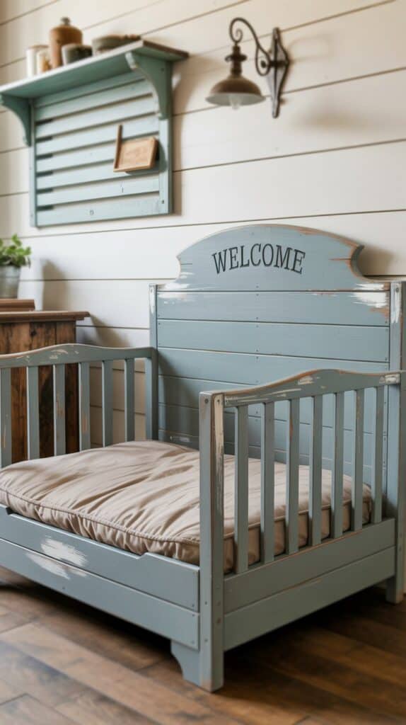An old coffee table is one of the easiest pieces to turn into a raised dog bed. Flip the table upside down so the legs become decorative posts, then give the whole thing a gentle sand. A coat of cream, soft grey, or sage green paint instantly gives it a warm farmhouse look.
