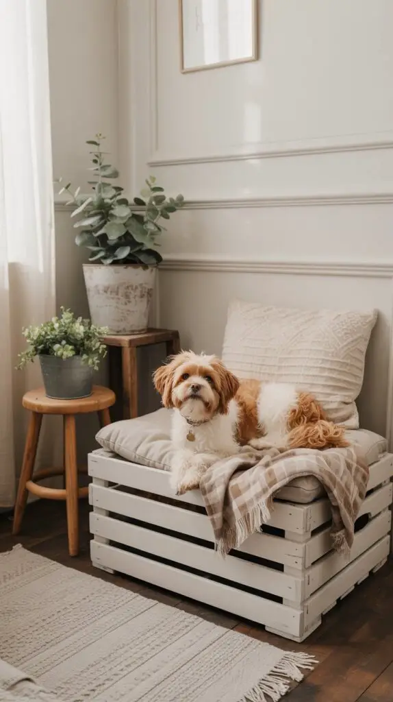 A large wooden crate — vintage or new — makes a wonderful rustic dog bed. Sand the surface, reinforce the base if your dog is on the heavier side, and stain or whitewash the wood for a softer farmhouse feel.