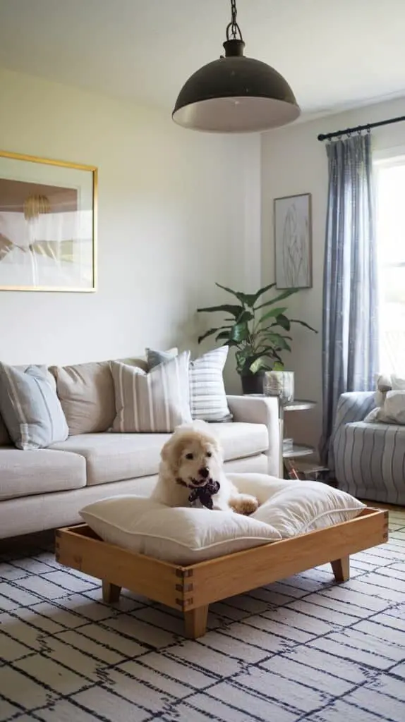 These farmhouse-style ideas feel homemade in the best way. You’ll see raised designs, little couch-style setups, rustic wooden frames, and even comfy nook beds tucked inside old furniture pieces. They look intentional in the living room instead of “oh, that’s the dog’s corner”. Your dog gets comfort, and you get a prettier house. Honestly, it’s a win for everyone.