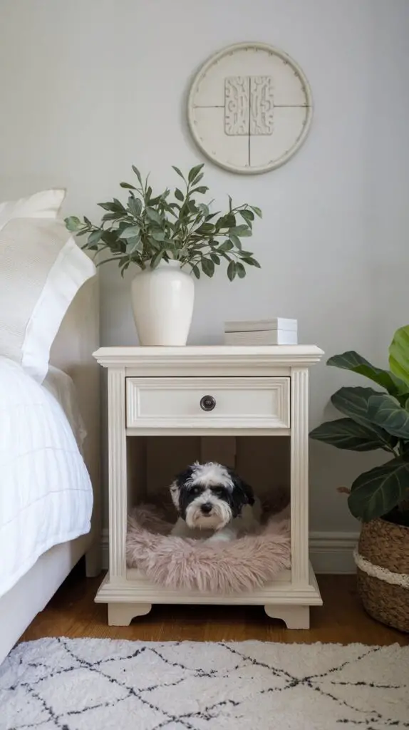 A chunky wooden nightstand can easily be turned into a snug little dog nook. Remove the drawers, sand everything down, and paint the inside and outside a soft farmhouse shade like linen, ivory, or muted grey. Add a fluffy cushion inside, and suddenly it’s a tiny hideaway bed.