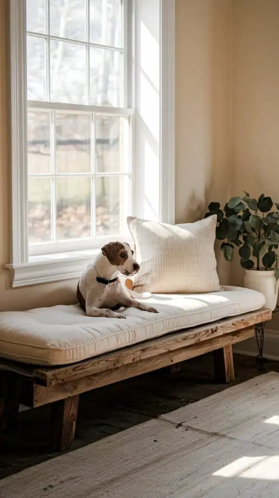 If the bench has a backrest, you can keep it for that rustic cottage charm or remove it for a lighter, modern look. This style works super well for medium and large dogs, and it slots nicely beside a window, under a gallery wall, or right in the living room without stealing attention. It’s comfortable, pretty, and feels like a handmade pet couch rather than something store-bought.
