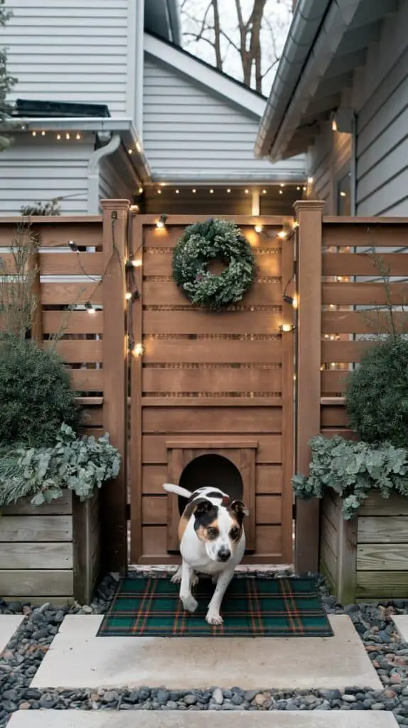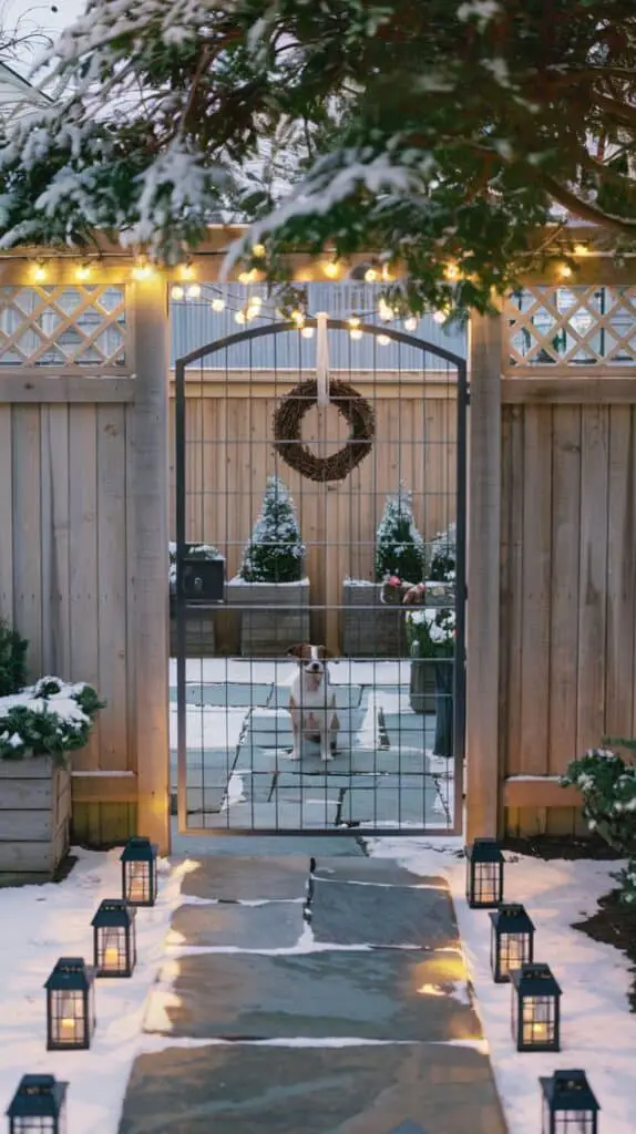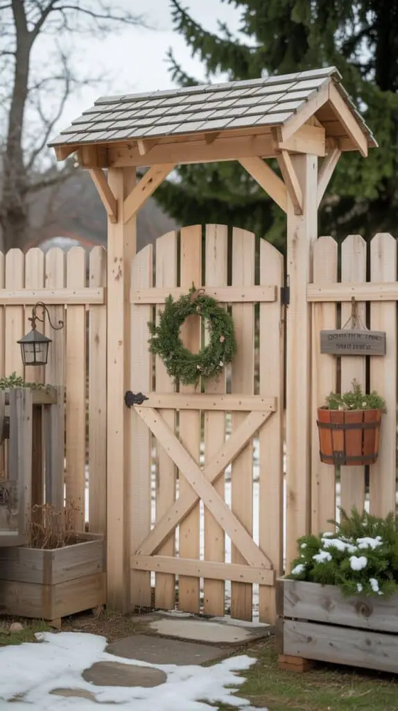 Use vertical wooden slats for privacy and add planters filled with hardy winter greens on either side. Cozy details like string lights around the gate or a plaid mat near the entrance make it feel homely, even in chilly weather.