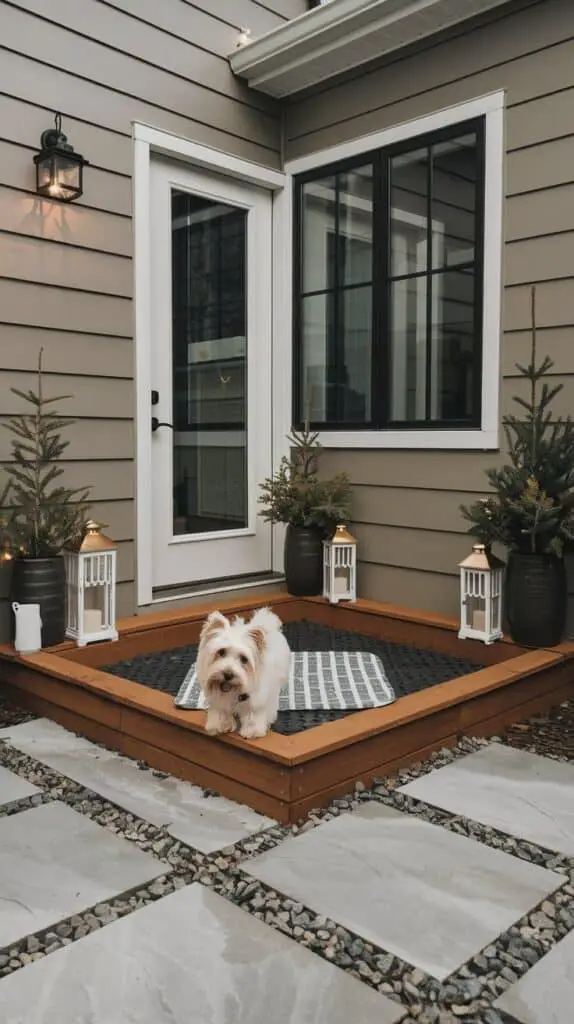 Decorate around the edges with small potted evergreens or lanterns for a bit of warmth. This setup works beautifully beside a back door — perfect for letting dogs outside without them turning the garden into a snow trench.