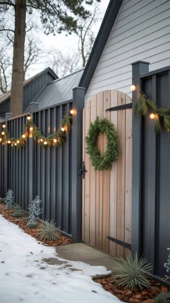 If your home leans modern, you can still keep things cozy. Black powder-coated metal fencing looks sleek year-round but feels inviting in winter when paired with soft outdoor lighting and natural decor. Try hanging mini pine garlands or neutral string lights along the top rail.