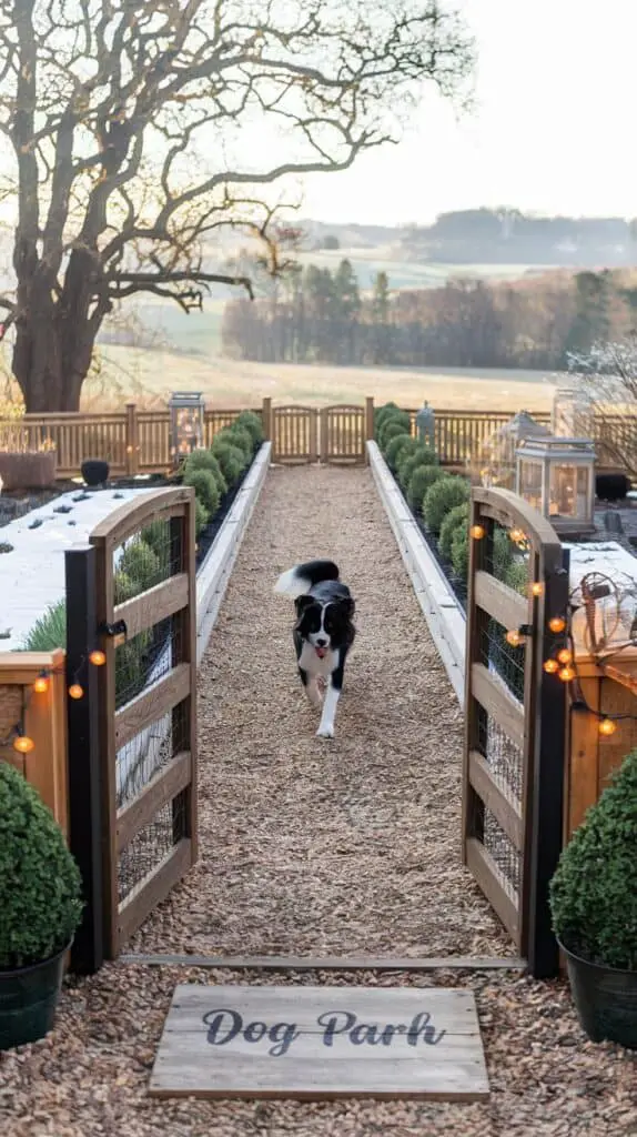 Along the outside, plant evergreen shrubs or line up potted boxwoods so it looks neat and green even in the cold months. Inside, lay gravel or flagstone to keep paws clean and mud-free. Decorate the outer edge with warm fairy lights, maybe a vintage-style sign that says “Dog Park,” and it’ll feel charming, not utilitarian. This one’s especially great if your view overlooks a field or hillside — your pup gets freedom, and you get to enjoy the sight of them safely exploring in the frost.