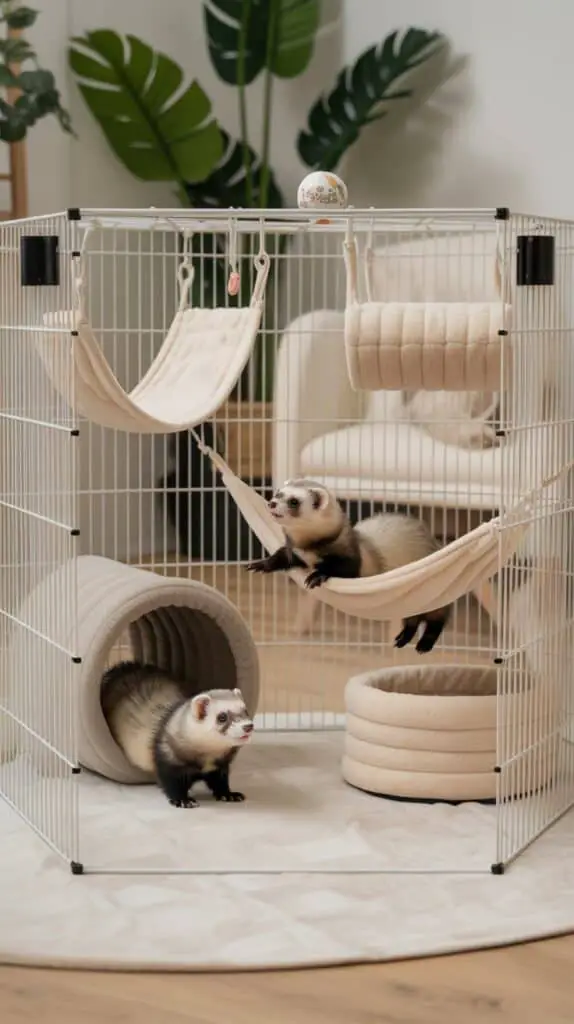 Add some natural elements like smooth rocks, small logs, or plant-safe greenery. It turns a plain space into a ferret playground that’s both enriching and easy on the eyes.