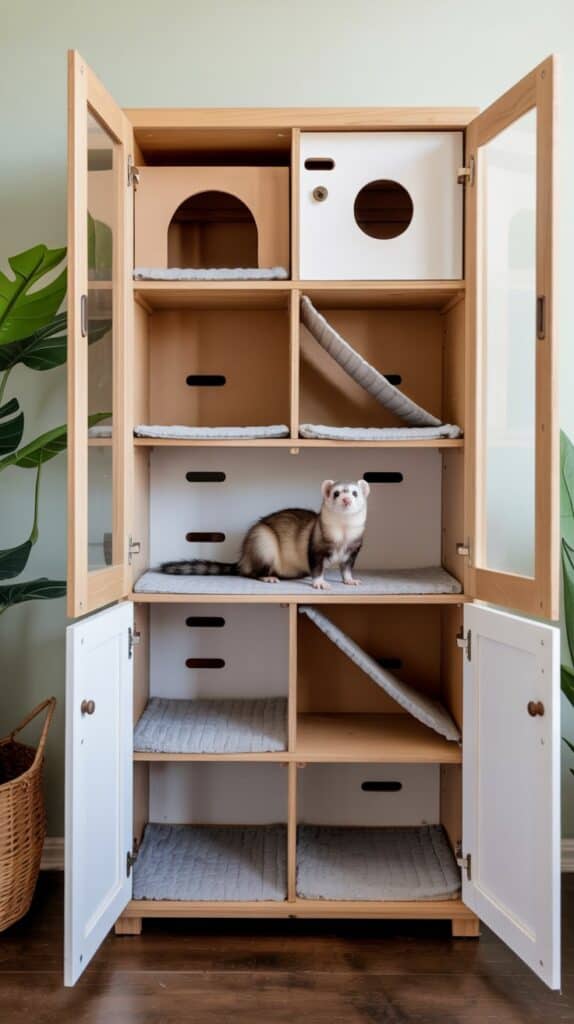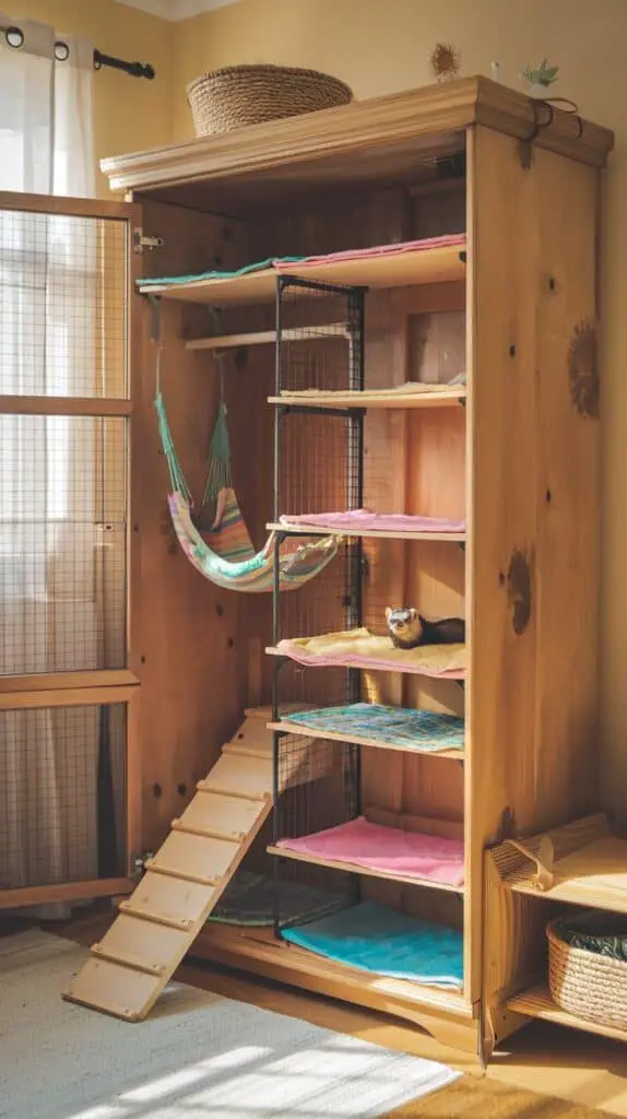 This one’s for the creative DIY crowd. You can transform an old wardrobe, shelving unit, or cabinet into a spacious ferret condo with multiple levels and plenty of personality.