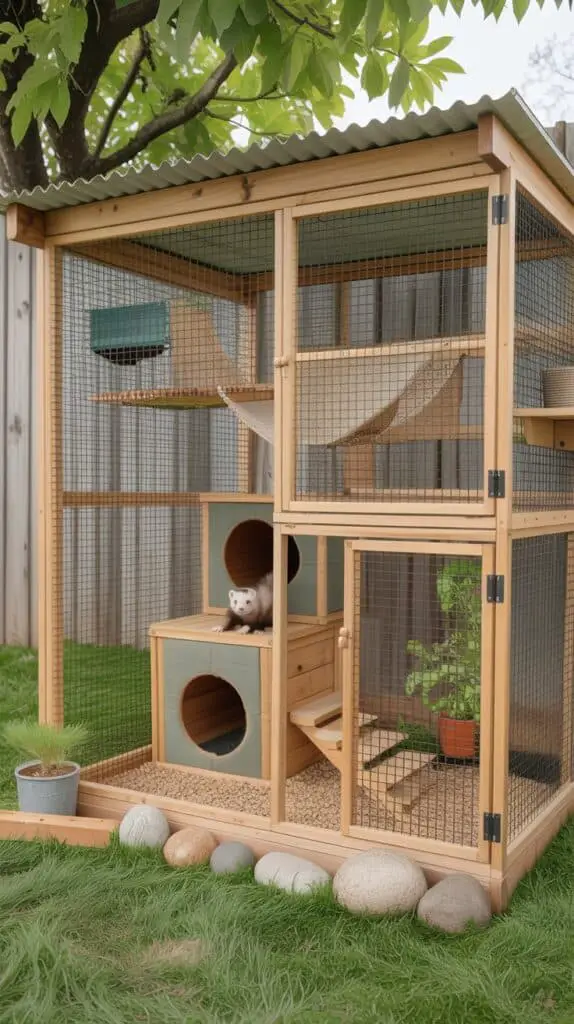 For those with a bit of outdoor space, an outdoor ferret enclosure gives your pets fresh air and sunlight (supervised, of course). Think of it as a mini aviary or “ferret greenhouse” — a secure area with mesh walls, a shaded roof, and elevated sleeping boxes.