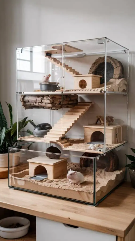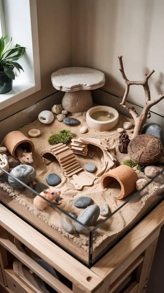 The key is layering — build upward instead of outward. It saves space and gives your hamster multiple levels to explore. You can decorate with bark, pebbles, and a few faux plants for realism.