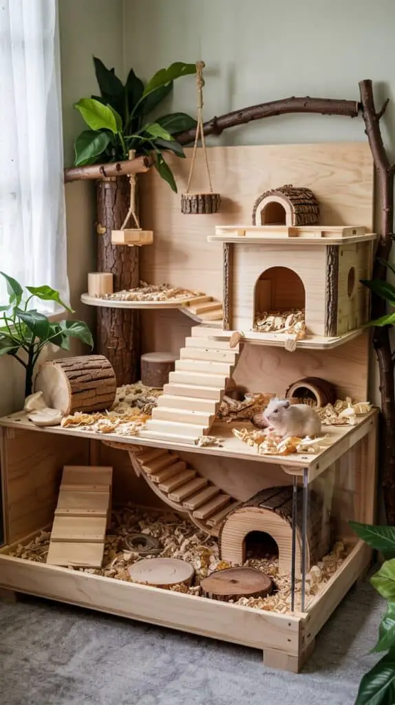 Use natural pine or birch wood to build tunnels, bridges, and platforms. Add ramps connecting different levels and fill the digging area with paper bedding or coconut fiber. Hang tiny rope ladders or wooden swings for enrichment.