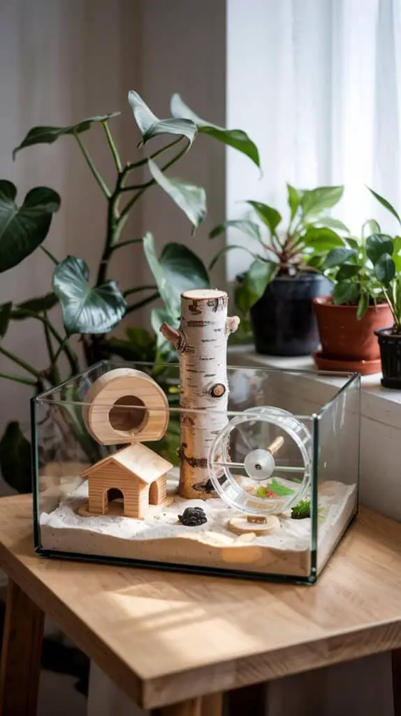 This setup not only keeps your hamster active and stimulated but also doubles as a beautiful centerpiece. It looks polished, intentional, and very “Pinterest-ready” — proof that pet care and good design can absolutely coexist.