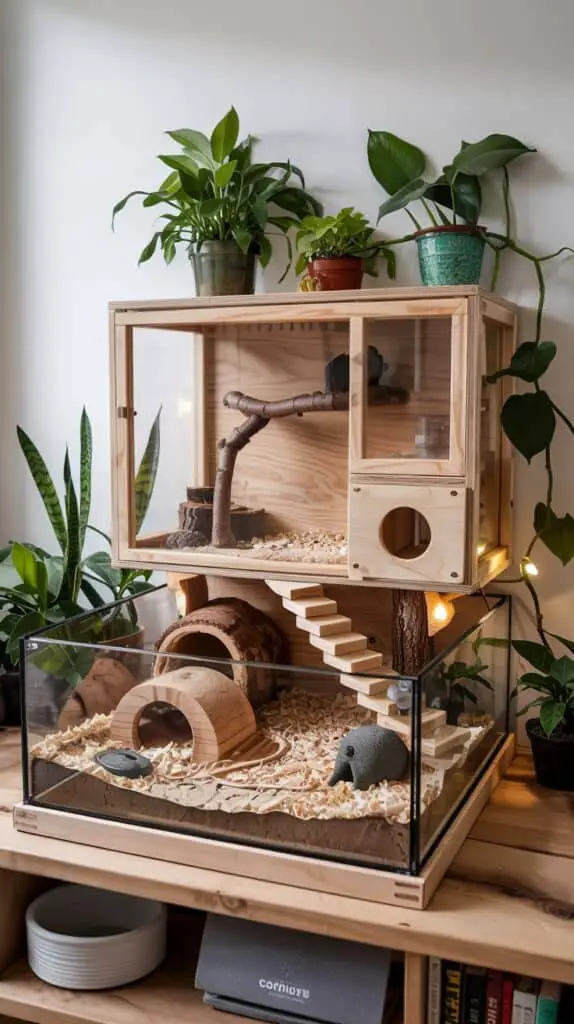 This hybrid setup feels balanced — practical, cozy, and stylish enough to fit right beside your houseplants or bookshelf. It’s a space where your hamster can dig, climb, and explore, while you get to enjoy a little slice of calm design magic.
