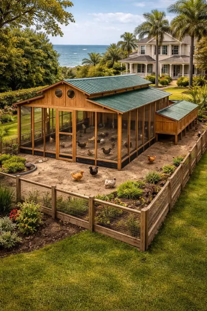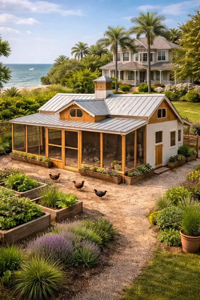 This type of chicken coop and run layout keeps the interior coop cleaner while giving chickens plenty of outdoor space. For backyard farms near the coast, it creates a practical balance between a beautiful chicken coop, a functional chicken house design, and a garden-friendly farm layout.