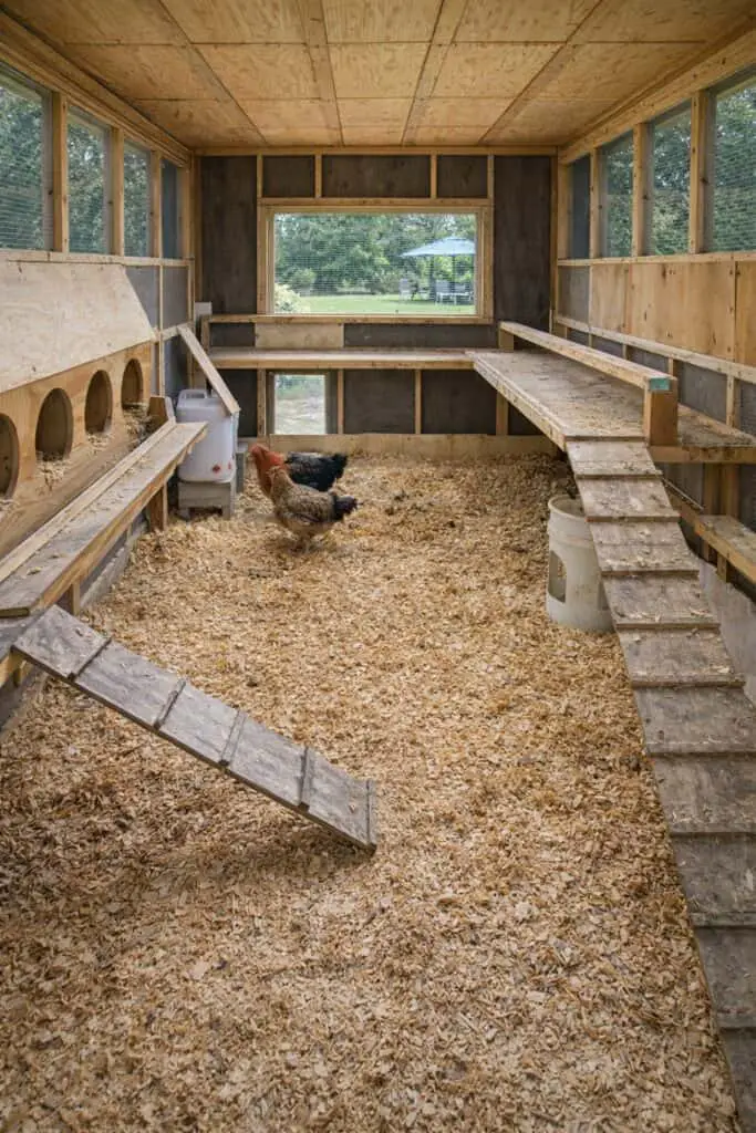 Instead of placing roost bars at one level, a raised platform allows multiple tiers of roosting areas. Chickens naturally prefer higher sleeping spots, so tiered perches give birds plenty of room while keeping the floor area clear.