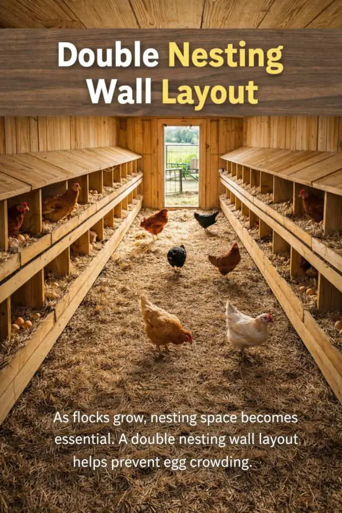 As flocks grow, nesting space becomes essential. A double nesting wall layout helps prevent egg crowding and competition between hens.