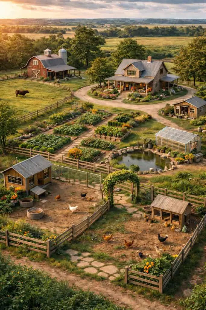 A well-planned layout often includes vegetable gardens, barns, greenhouses, and animal shelters arranged around a central farmhouse. Chickens can rotate through different fenced areas, helping manage pasture health and reduce waste buildup.