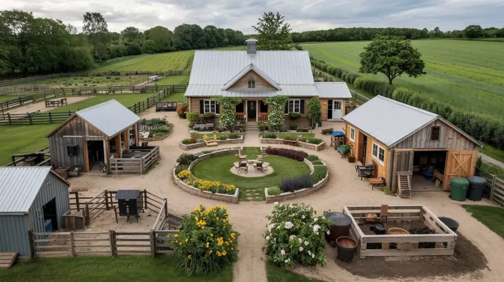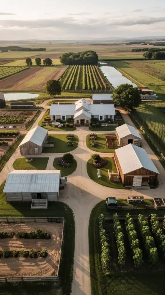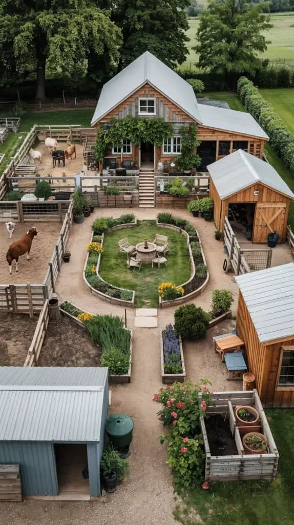 Some of the most beautiful hobby farms are designed around a courtyard — a functional and social heart that ties everything together. From above, this type of layout looks symmetrical and organized, with the home, barn, workshop, and gardens all surrounding a shared open space.