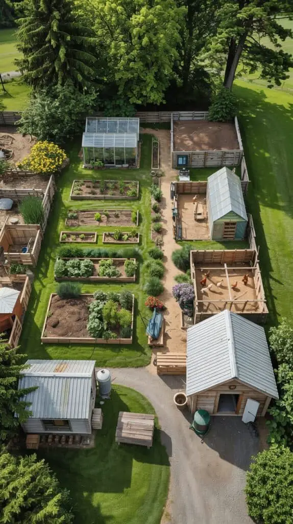 From the air, the 5-acre layout looks like a patchwork of purpose — every section serving a clear role. Yet it still feels personal: maybe a row of sunflowers along the fence, a shaded bench by the pond, or a children’s play garden near the orchard.