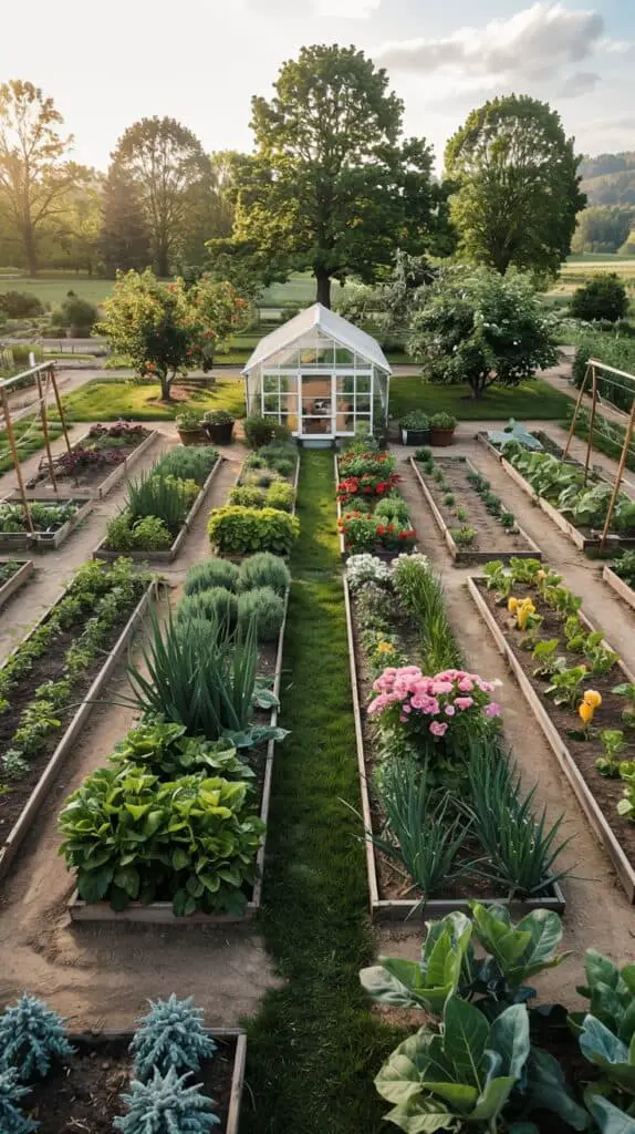 The farmhouse sits at one edge of the land, looking out over a series of structured gardens: herb spirals, raised vegetable plots, and pathways framed by lavender and rosemary. A greenhouse sits near the back, with a shaded area for seed trays and potting benches. Along the sides, fruit trees and climbing vines create a sense of enclosure.