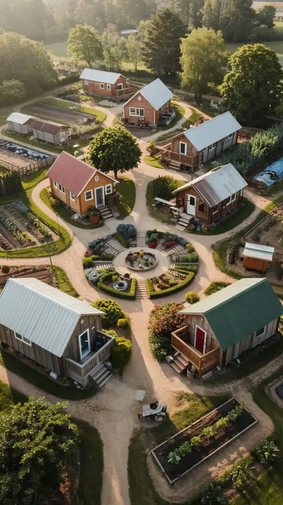 At the center, there’s a large communal garden or green space where everyone can gather — think picnic tables, outdoor kitchen, maybe even a shared barn. Around it, each small home or cabin sits privately among trees or flower beds.