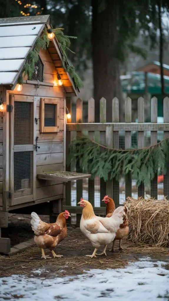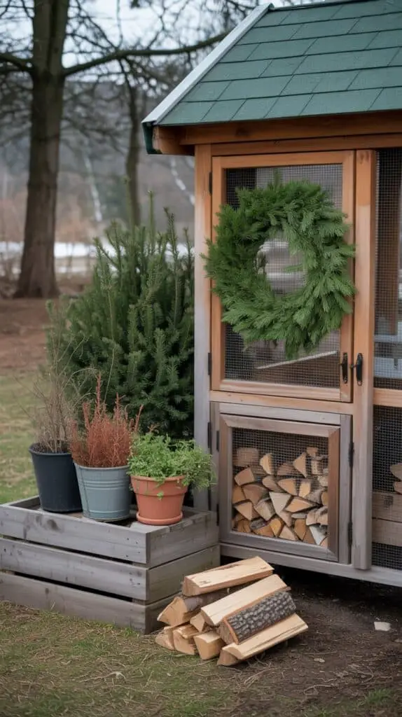 Instead of plastic décor, use the season itself to beautify the yard. Evergreen shrubs, potted winter herbs, or wooden planters filled with pine branches can transform the area around the coop into a cozy winter garden. Even a small stack of chopped firewood placed nearby adds to that rustic, wintry charm and makes the whole area feel welcoming.